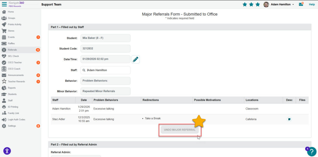 Once the minor has been submitted as a major, a referral admin can undo the action, if necessary. The minor referrals will be moved back into the list of minor referrals displayed for the student.