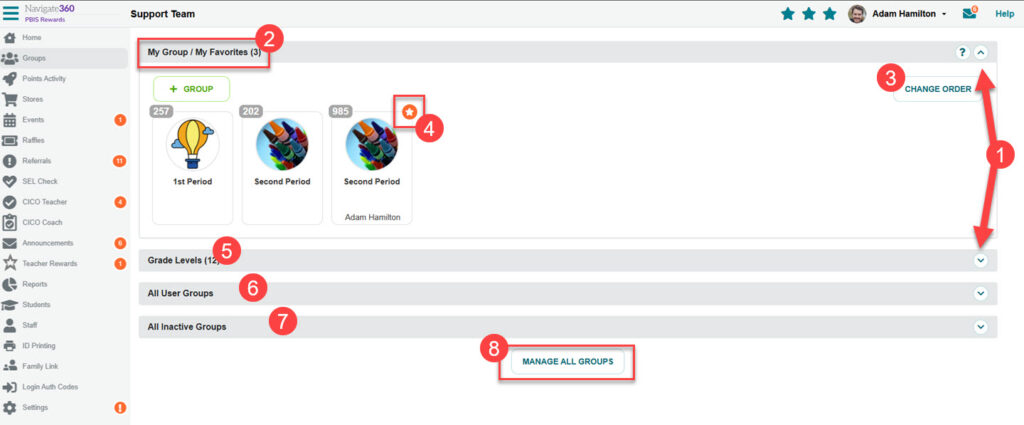 Awarding points for multiple students is easy using the “Groups” page from the Web Portal. Select “Groups” from the left-side main menu.