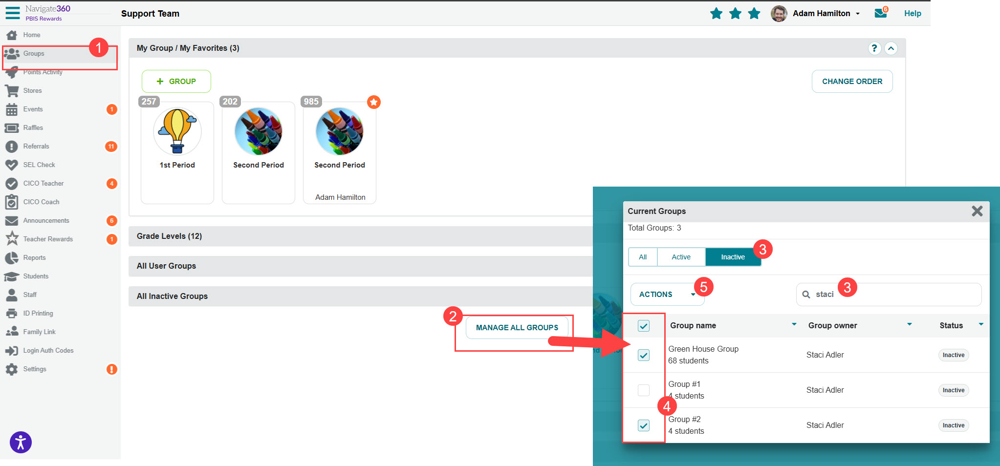 - Search for the appropriate groups by name or group owner or select the “Inactive” filter.